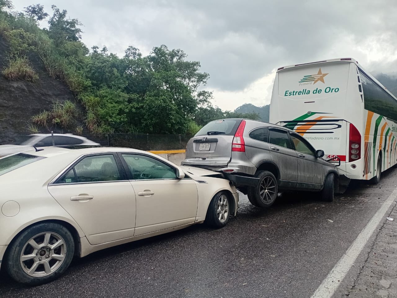 De acuerdo con los reportes, se trató de una carambola que involucró a cuatro vehículos, entre ellos, una Nissan tipo Altima, beige, una camioneta Honda tipo CR-V, un autobús de pasajeros de la línea Estrella de Oro, con el número económico 1556 y una camioneta Nissan tipo Frontier, doble cabina, blanca.