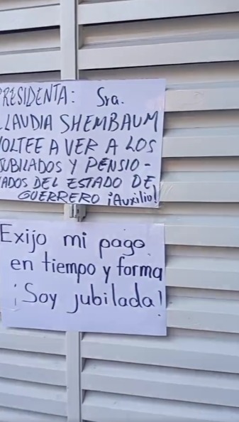 Una grupo reducido de jubilados, colocaron pancartas en el exterior de las oficinas del Instituto, en los que se lee: «Presidenta Claudia Sheumbaun, voltee los ojos hacia Guerrero».