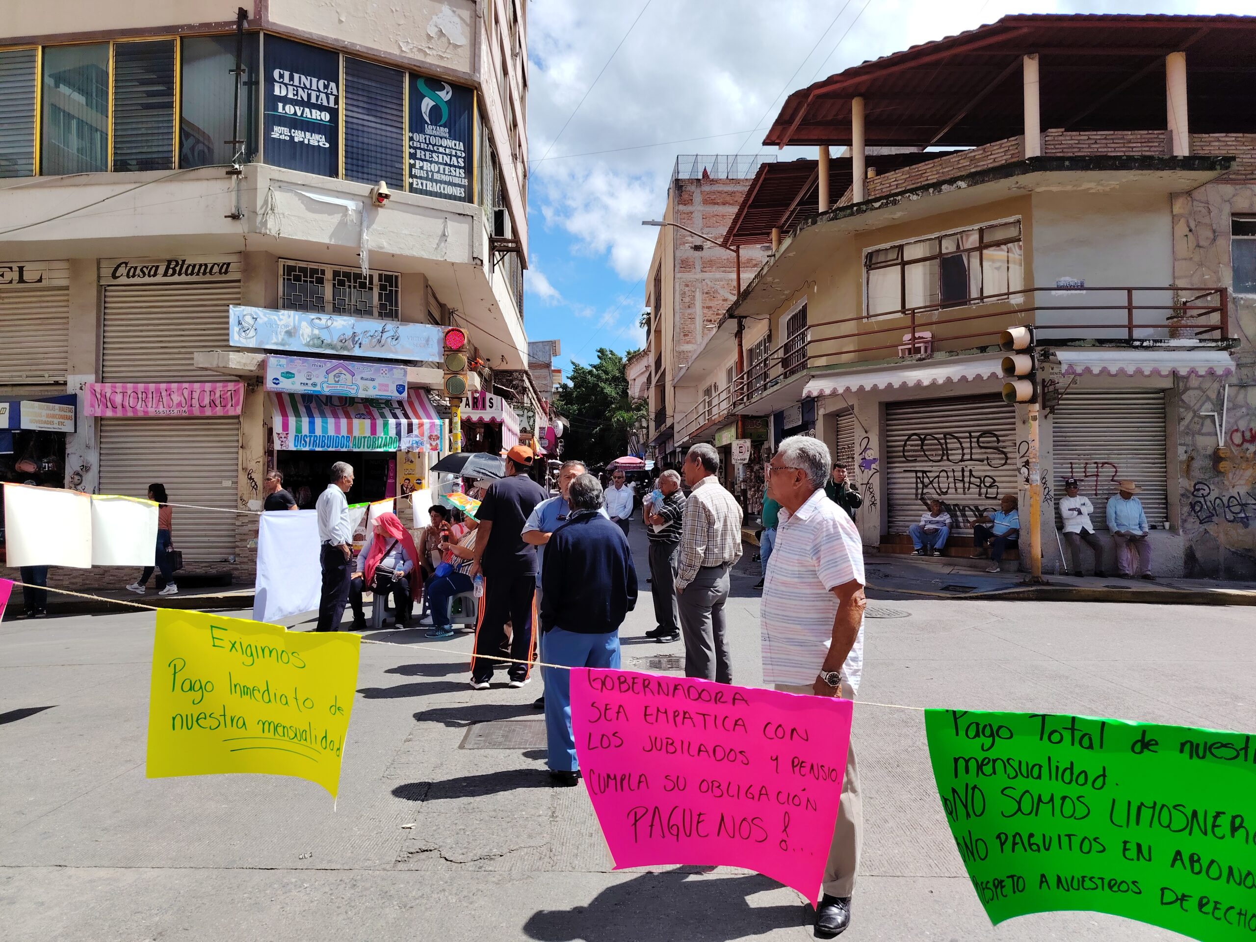 De acuerdo con los manifestantes, quienes con sillas y un tendero de pancartas protestan sobre las avenidas Benito Juárez e Ignacio Ramírez y la calle Francisco I. Madero, que el organismo enfrenta con los jubilados diversos adeudos.