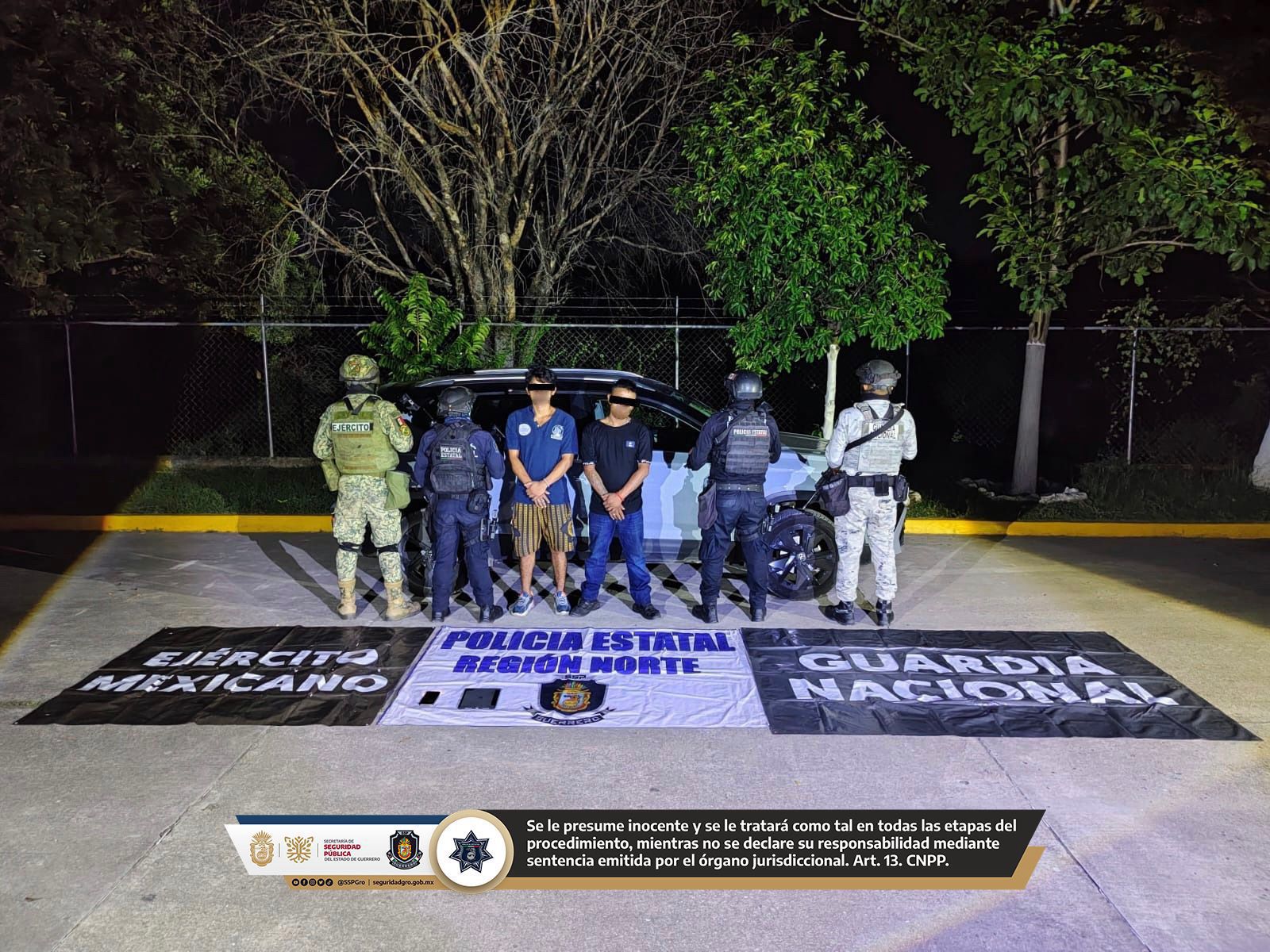 Chilpancingo, Gro., 20 de septiembre de 2025. Como resultado de la coordinación entre la Secretaría de Seguridad Pública de Guerrero a través de la Policía Estatal, la Secretaría de la Defensa Nacional, la Guardia Nacional y el Gobierno de Morelos, fueron detenidos dos hombres y asegurado un vehículo con reporte de robo en la colonia Las Tres Iguanas, municipio de Iguala.