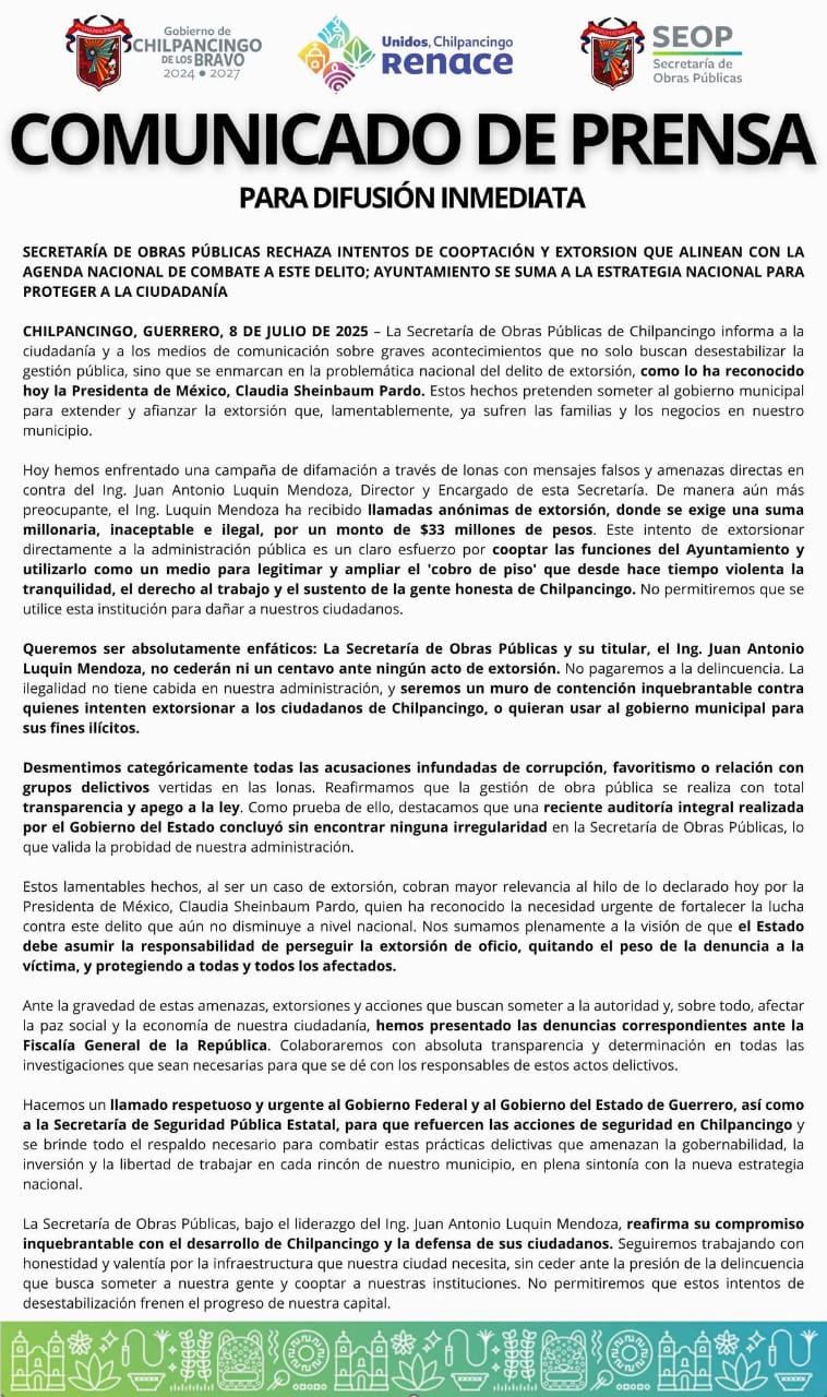 Denuncian que intentan extorsionar al secretario de Obras Públicas del municipio de Chilpancingo con 33 millones de pesos