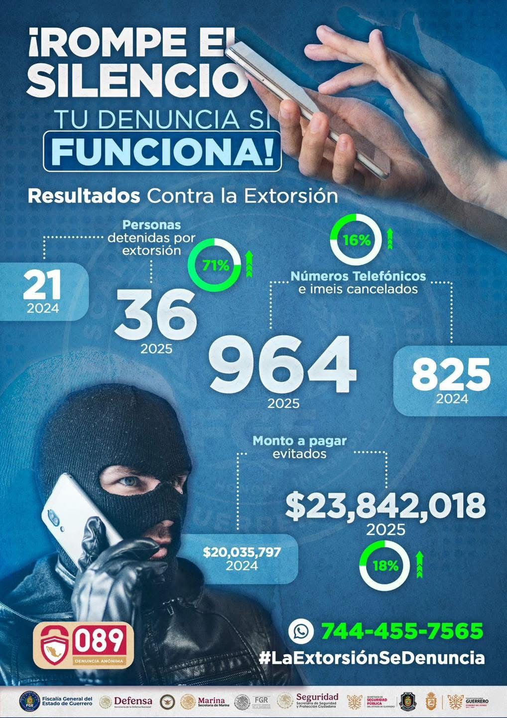 Las autoridades reiteraron el llamado a la población para denunciar cualquier intento de extorsión de manera anónima a la línea 089 o vía WhatsApp al 744-455-7565, recordando que #LaExtorsiónSeDenuncia y que la participación ciudadana es clave para erradicar este delito.
