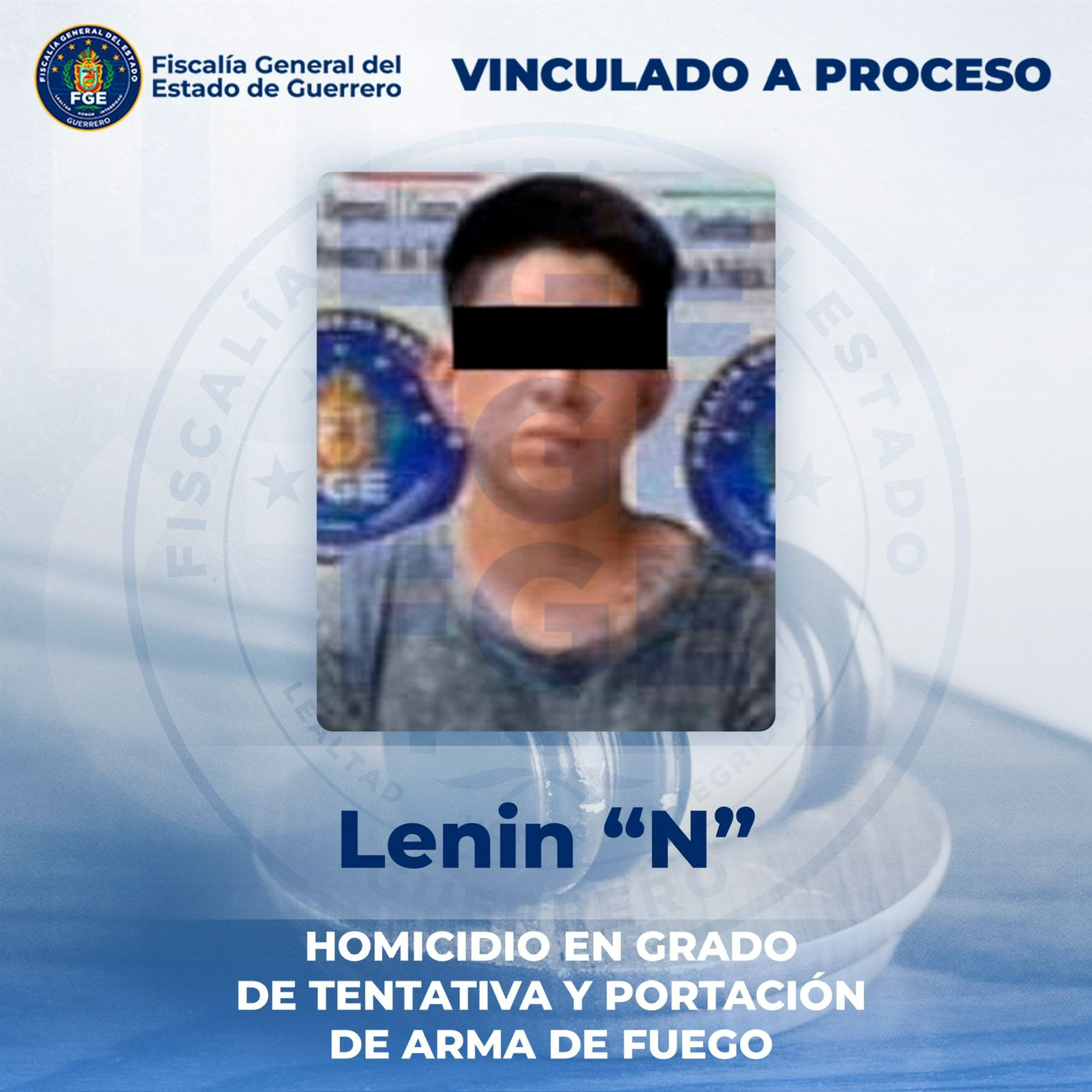 La Fiscalía General del Estado de Guerrero (FGE) informó que logró la vinculación a proceso contra Lenin “N”, por su probable responsabilidad en los delitos de homicidio en grado de tentativa y portación de arma de fuego, en agravio de Vladislav “N”, elemento de Tránsito y Vialidad del municipio de Chilpancingo.