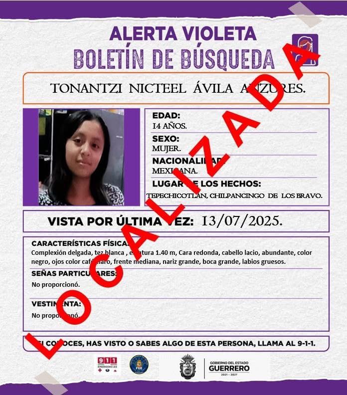 Mochitlán, Gro., 25 de julio de 2025. En acciones operativas conjuntas y de atención oportuna a las denuncias ciudadanas a través de la Alerta Violeta, autoridades de seguridad localizaron y resguardaron a una adolescente de 14 años de edad, quien había sido reportada como no localizada en el municipio de Mochitlán.