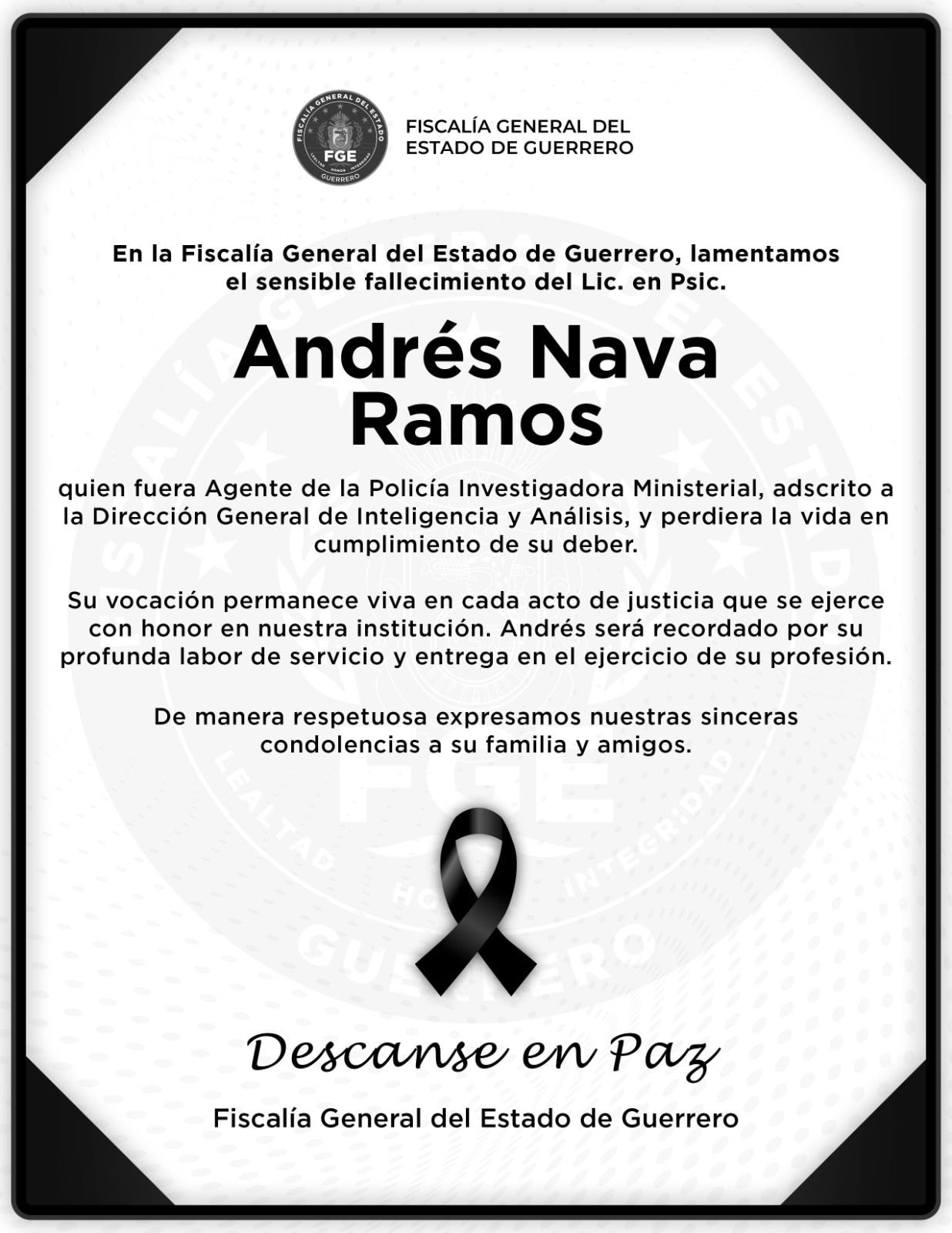 Andrés Nava Ramos, estaba adscrito a la Dirección General de Inteligencia y Análisis de la Fiscalía de Guerrero. En el hecho también habría resultado herido por proyectil de arma de fuego otro elemento más de nombre Elías N.