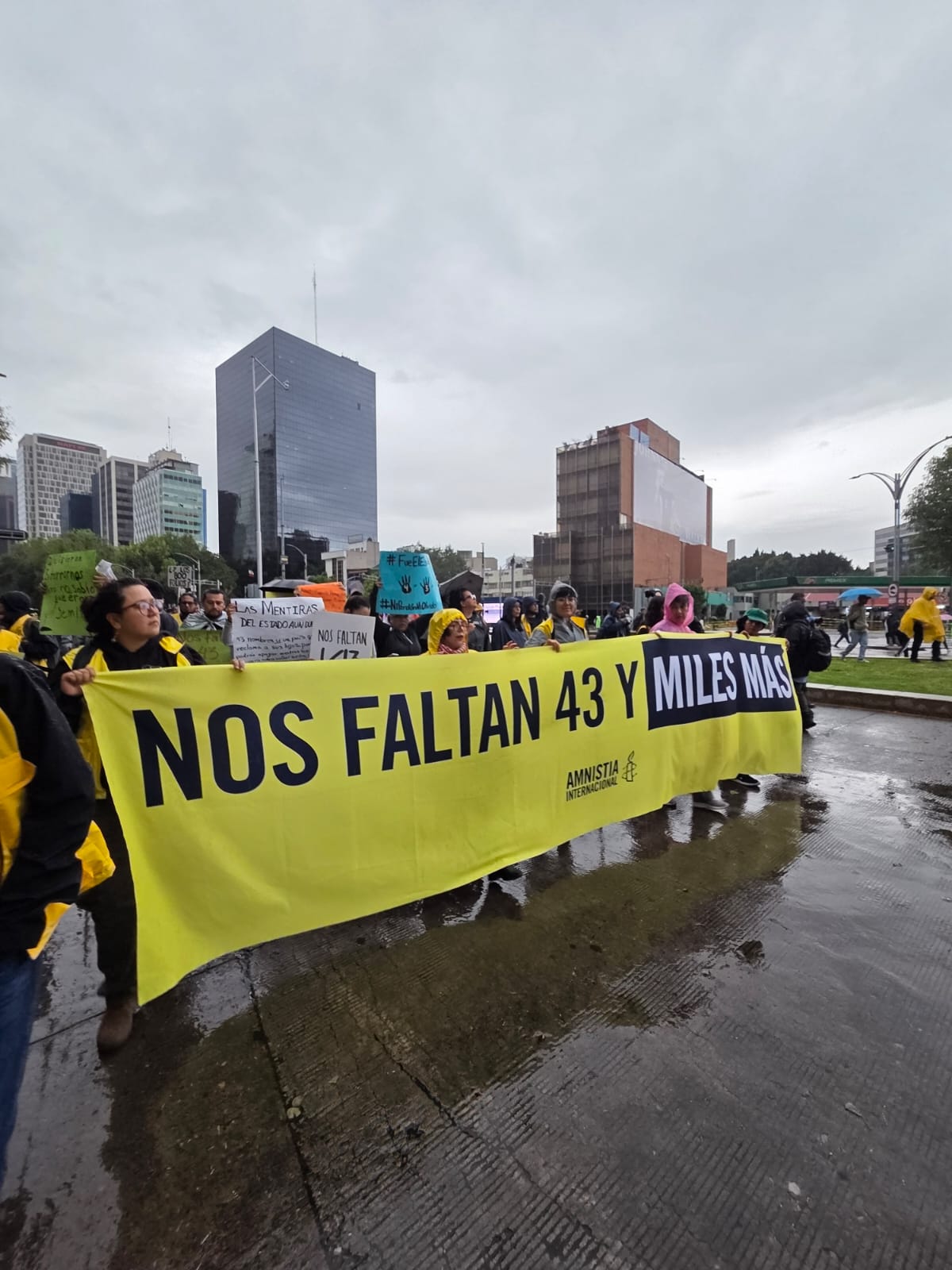 En el marco de la movilización de los padres de los 43 normalistas de Ayotzinapa a once años de su desaparición, la sección mexicana de Amnistía Internacional participó en el respaldo en la concentración de este día en la Ciudad de México.