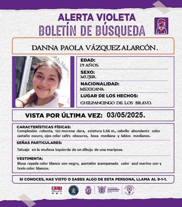 Piden ayuda para localizar a la joven Danna Paola Vázquez Alarcón, de 19 años de edad, ella fue vista por última vez el 3 de mayo en Chilpancingo.