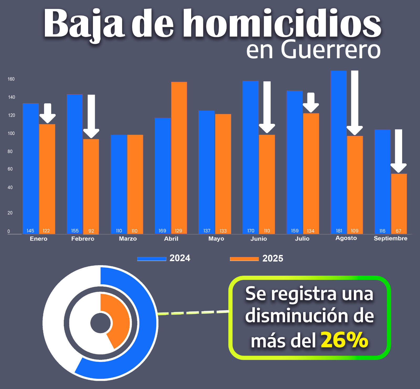 Chilpancingo, Gro., 24 de septiembre de 2025. – Como resultado de los operativos permanentes y de las acciones de reforzamiento en materia de seguridad, Guerrero refleja una incidencia a la baja de un 26% en homicidios dolosos en lo que va de este 2025.
