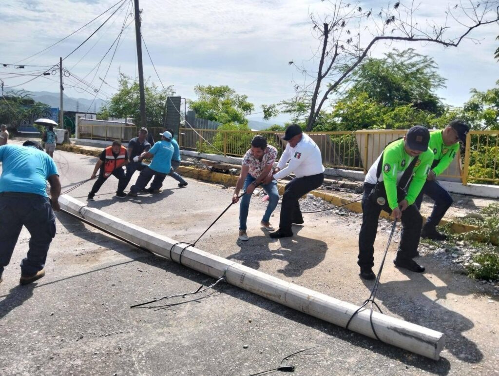 Personal de Protección Civil trabaja en el retiro de postes que cayeron durante la mañana de este martes, que provocó el cierre temporal de la carretera federal Acapulco-México, a la altura de La Cima-Las Cruces, a consecuencia de las lluvias.