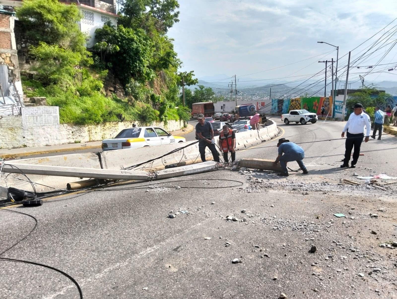 Uno de los postes cayó sobre una camioneta, lo que complicó más el tránsito vehicular sobre la vialidad.