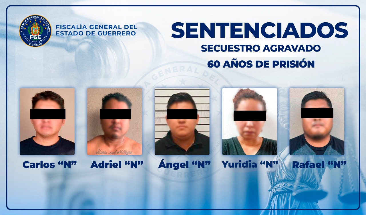 Chilpancingo, Gro., 23 de julio.- La Fiscalía General del Estado de Guerrero (FGE Guerrero) obtuvo una sentencia condenatoria de 60 años de prisión en contra de Adriel “N”, Rafael “N”, Carlos “N”, Ángel “N” y Yuridia “N”, acusados por su responsabilidad penal en el delito de secuestro agravado, en agravio de una víctima de identidad reservada.