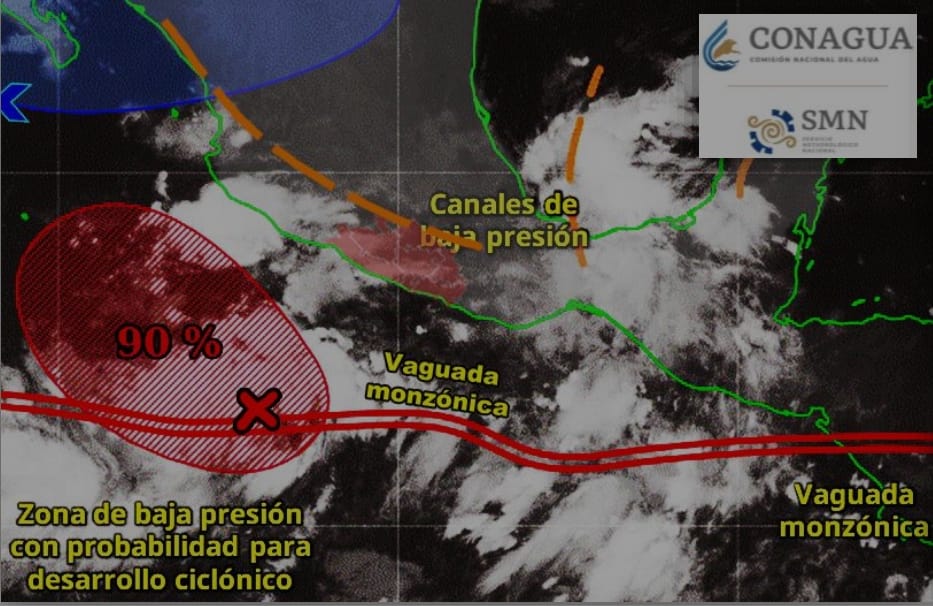 Continúa en vigilancia una Zona de Baja Presión que se localiza aproximadamente a 800 kilómetros al suroeste de Acapulco, presentando un 90 por ciento de probabilidad para desarrollo ciclónico en 7 días, con la posibilidad de que este viernes alcance la categoría de Depresión Tropical y mañana la de Tormenta Tropical.