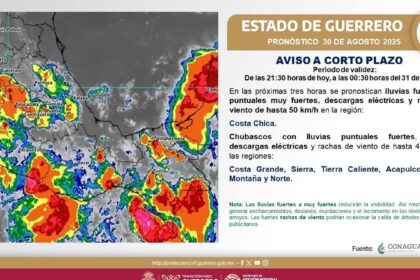 ACTUALIDAD/Redacción Chilpancingo, Gro., 30 de agosto.- La Secretaría de Gestión Integral de Riesgos y Protección Civil, emitió esta noche un aviso de corto plazo, consistente del periodo de las 21:30...